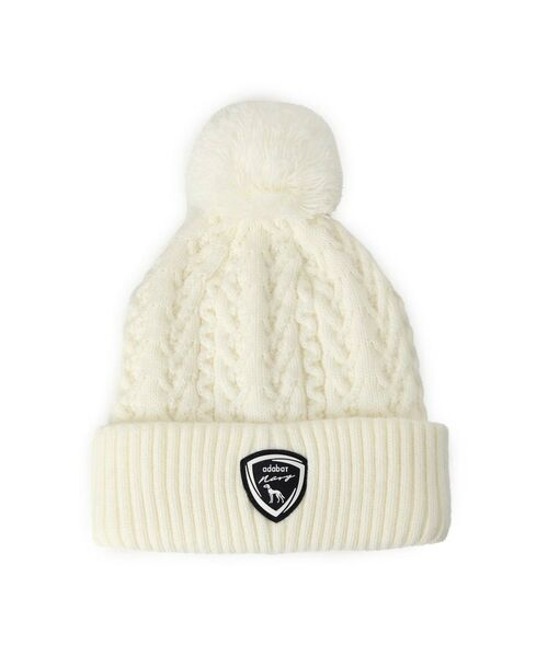王道のケーブルニットデザインにポンポンがアクセントとなり、可愛らしさを引き立てます。