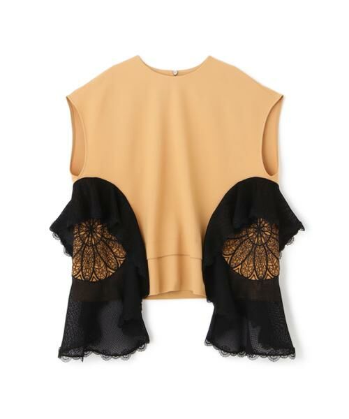 両サイドにオリジナル柄のチュールレースのパーツとレノクロスのラッフルがついた華やかなブラウスです。