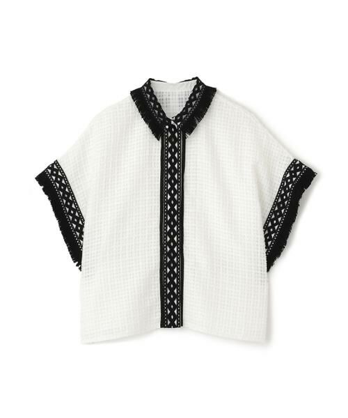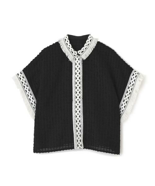 メッシュの様な隙間のあるツィードでレースの様な軽く柔らかい印象の素材を使った、続き袖のシャツ襟ブラウスです。