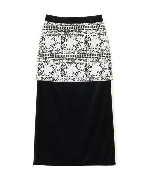 モダンで上品なリュクスオーナメントレーススカートアーカイブレースを使用したエクスクルーシブなスカートです。ストレートシルエットでアーカイブのレースとレイヤーされたベロアがコンビになったスカートです。同素材ブラウス(品番:531-5210910)とのセットアップ着用もおすすめです。しっとりとした上品な艶が特徴なトリアセテートを使用した、しなやかでなめらかな風合いが特徴なベロア素材で仕立てました。※この商品は、ブラック / ホワイト の2色展開となります。【商品特性】透け感:ややあり裏地:あり伸縮性:なし生地の厚さ:普通フィット感:ルーズおすすめ着用期間:春夏秋おすすめ着用シーン:オケージョン透け感/なし|裏地/あり|光沢/なし|生地の厚さ/普通|伸縮性/あり|シルエット/スタンダード