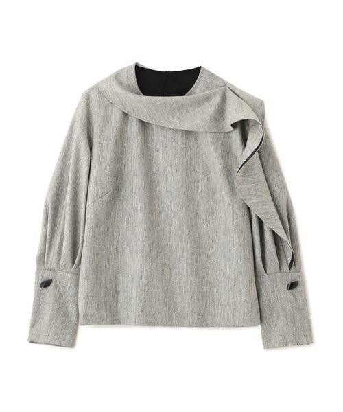 ロールカラーが片袖に向かってラッフルになっていくアシンメトリーなデザインのブラウスで顔まわりがぱっと華やかになります。