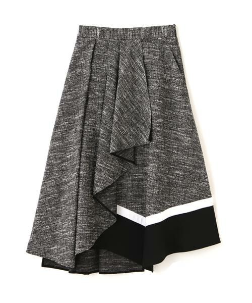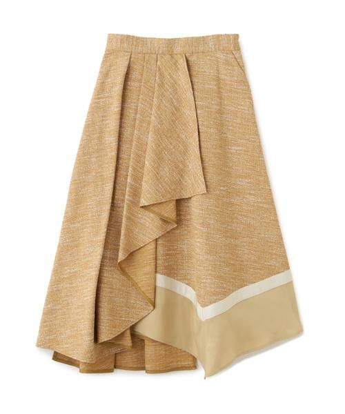 ライトに織り上げたスラブツイード素材のアシンメトリースカート白いスラブ糸が入ったツイード素材のアシンメトリースカート。イレギュラーヘムで裾はサテンとグログラン切り替えでラインが入った様なデザインになっています。同素材ブラウス(品番:531-5210109)とのセットアップ着用もおすすめです。ツイーディーな素材の厚さを抑えるため、ウールの紡毛を使用せず、ポリエステルのスラブ糸とコットンで軽く、ライトに織り上げた素材で仕立てました。※この商品は、ブラック / ベージュ の2色展開となります。【商品特性】透け感:なし裏地:あり伸縮性:なし生地の厚さ:普通フィット感:普通おすすめ着用期間:春秋冬おすすめ着用シーン:通勤透け感/なし|裏地/あり|光沢/ややあり|生地の厚さ/普通|伸縮性/なし|シルエット/スタンダード