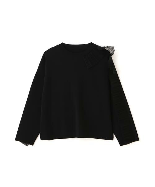 儚さと華やかさを併せもつエンベリッシュトニット魚のひれをイメージしてクリスタルプリーツをかけたチュールをアシンメトリーに袖から襟ぐりにかけて配したニットトップス。はかないプリーツが繊細かつ華やかな1枚です。アセテートとストレッチナイロンの撚糸素材で仕立てました。弱ストレッチとドライな感触が特徴的です。※この商品は、ブラック / イエロー の2色展開となります。透け感/なし|裏地/なし|光沢/なし|生地の厚さ/普通|伸縮性/ややあり|シルエット/スタンダード