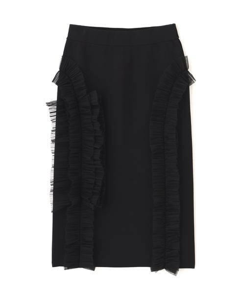儚さと華やかさを併せもつエンベリッシュトニットスカート魚のひれをイメージしてクリスタルプリーツをかけたチュールをたっぷりつけたニットスカート。はかないプリーツが繊細かつ華やかな1枚です。アセテートとストレッチナイロンの撚糸素材で仕立てました。弱ストレッチとドライな感触が特徴的です。※この商品は、ブラック / イエロー の2色展開となります。透け感/なし|裏地/なし|光沢/なし|生地の厚さ/普通|伸縮性/ややあり|シルエット/スタンダード