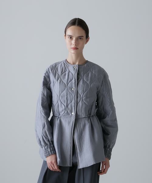 透け感と光沢感、表面の細かなシボが特徴の非常に軽い素材に、中綿を挟みキルティング加工した素材で仕立てました。