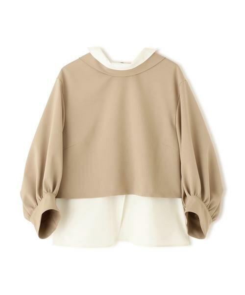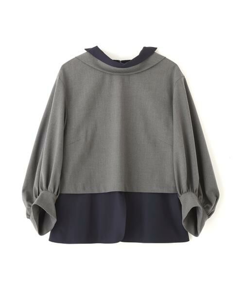 ロールカラートップスの下にシャツをレイヤードしているスタイリングが1枚で叶うブラウスです。