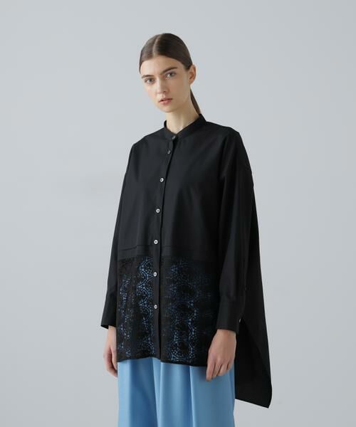 ややゆとりのあるシルエットで裾部分にレースがコンビネーションされたバンドカラーのブラウスです。