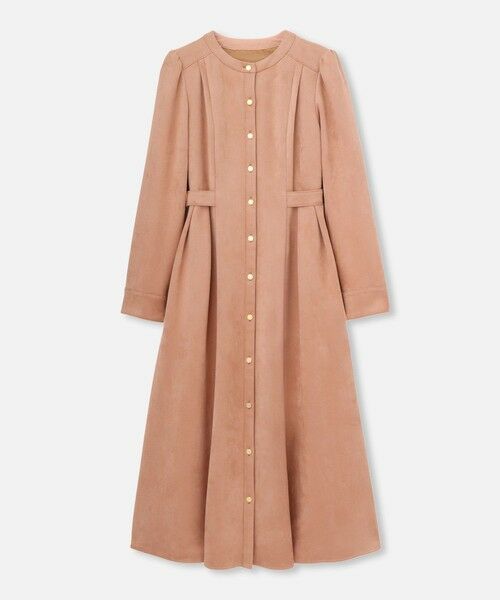 ストレッチの効いたフェイクスエードを使用した前開きのフィット&フレアワンピース。