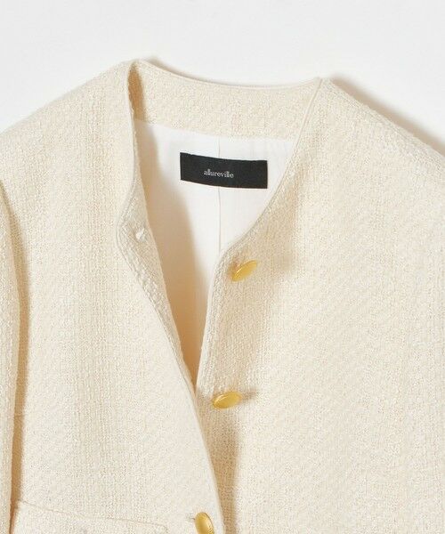 甘織のポリエステルツイードで表面感のある素材を使用したノーカラージャケット。