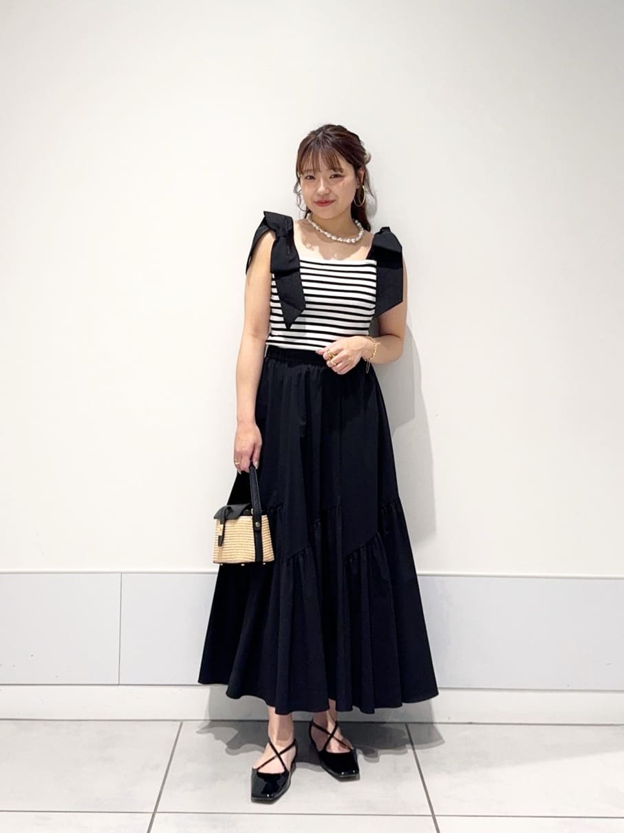 ・ショルダーリボンミニタンク 着用サイズ / 2(FREE) 取り外し可能なリボン付きプルオーバー。 肩を覆ってくれる大きなリボンで 華奢見え効果があり嬉しいポイントでした◎ 1枚で存在感のあるデザイントップスです。 身頃はシンプルになっておりますので ボトムは選ばずにスカート、パンツどちらとも 好バランスでお使いいただけます。 スクエアのネックラインが綺麗なので リボンを外してジャケットやシアートップスの インナーとしても◎ 丈感は短めになっており、 アウトしたままでスッキリとウエストにのる丈です。 レーヨン×ナイロンの耐久性のある生地で イージーケアもポイント。 タンクトップ使いから主役トップスまで 万能にお使いいただける優秀アイテムです! ※ご自宅でお洗濯可能 ・バイヤスキリカエギャザースカート 着用サイズ / 2 アルアバイルでご好評いただいているギャザースカート。 ティアードのデザインが斜めに切り返しの入る 新鮮な見え方で甘くなりすぎずに 着ていただけます。 ややハリのある生地感ですが 広がりすぎずに落ち感もあり 腰回りは膨らむことなくスッキリと、 裾にかけて程よいボリューム感をもたせてくれるので シルエットが本当に可愛いです! ウエストゴムですが フロント部分のみゴムを抜いており、 ベルト芯がありますので トップスインも綺麗に収まります◎ ギャザーも動きをつけてくれるので 気になるお腹周りも◎ ナイロンベースの生地で 汚れがつきにくくご自宅でのお洗濯も可能で、 ホワイトでも透け感が気になりずらいのも 嬉しいポイントです。 ※ご自宅でお洗濯可能 スタッフ身長 159㎝