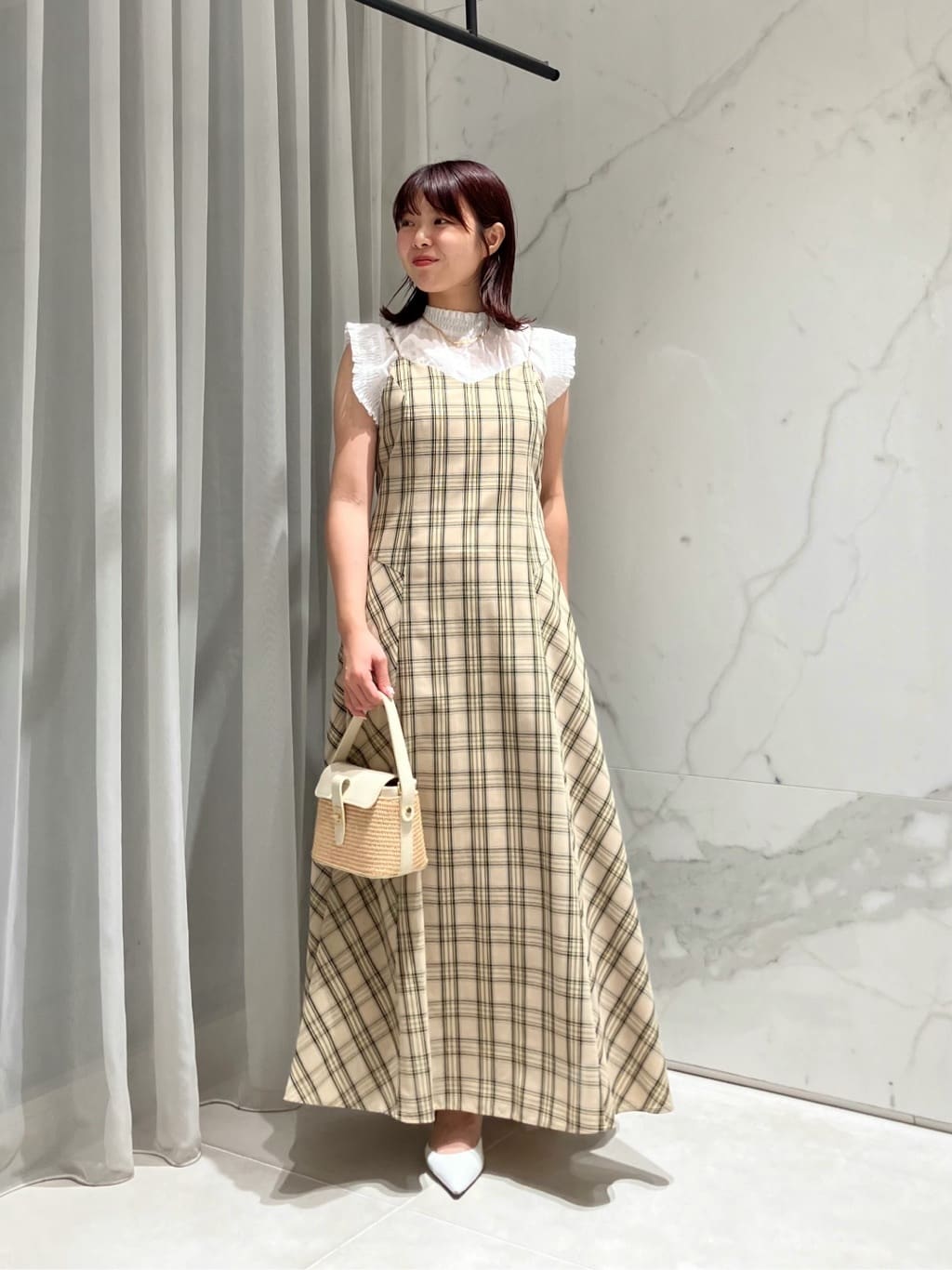 【シャーリングプルオーバー】 立体感シャーリングが可愛いブラウス。 凹凸感ある薄手めのコットン生地で、ゴムギャザーでストレスなく着ていただけます◎ 袖シャーリングが気になる二の腕周りをカバーしてくれるのが嬉しいポイント♪ コンパクトな丈がインせずに、綺麗なシルエットで着ていただけます◎ デイリーだけでなく、ジャケットのインナーで通勤スタイルにも、着回し力も高い一着です。 ◯着用感 透け感:なし(白のみ透け感あり) 伸縮性:ややあり 光沢感:なし 厚さ:薄手 ※手洗い可能 【チェックバックコンシャスキャミワンピース】 大人かわいいキャミワンピース。 ドライタッチで軽やかなチェック素材で、涼しく快適な着心地◎ 後ろ身頃のレースアップディテールが華やかで、ウエストより少し下に切り替え線を入れスッキリ美シルエットに。 アウターを着なくなる季節にぴったりの1枚です♪ 〇着用感 透け感 : なし 伸縮性:なし 光沢感:なし 厚さ:薄手 ※手洗い可能 スタッフ身長 155㎝