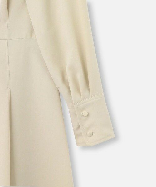 程よい胸元のVラインや、ウエストから上下に取ったタックデザインが柔らかくエレガントな印象を与え、袖口のカッチリと作ったカフスやくるみバックルのベルトがトラッドでマニッシュな印象に。