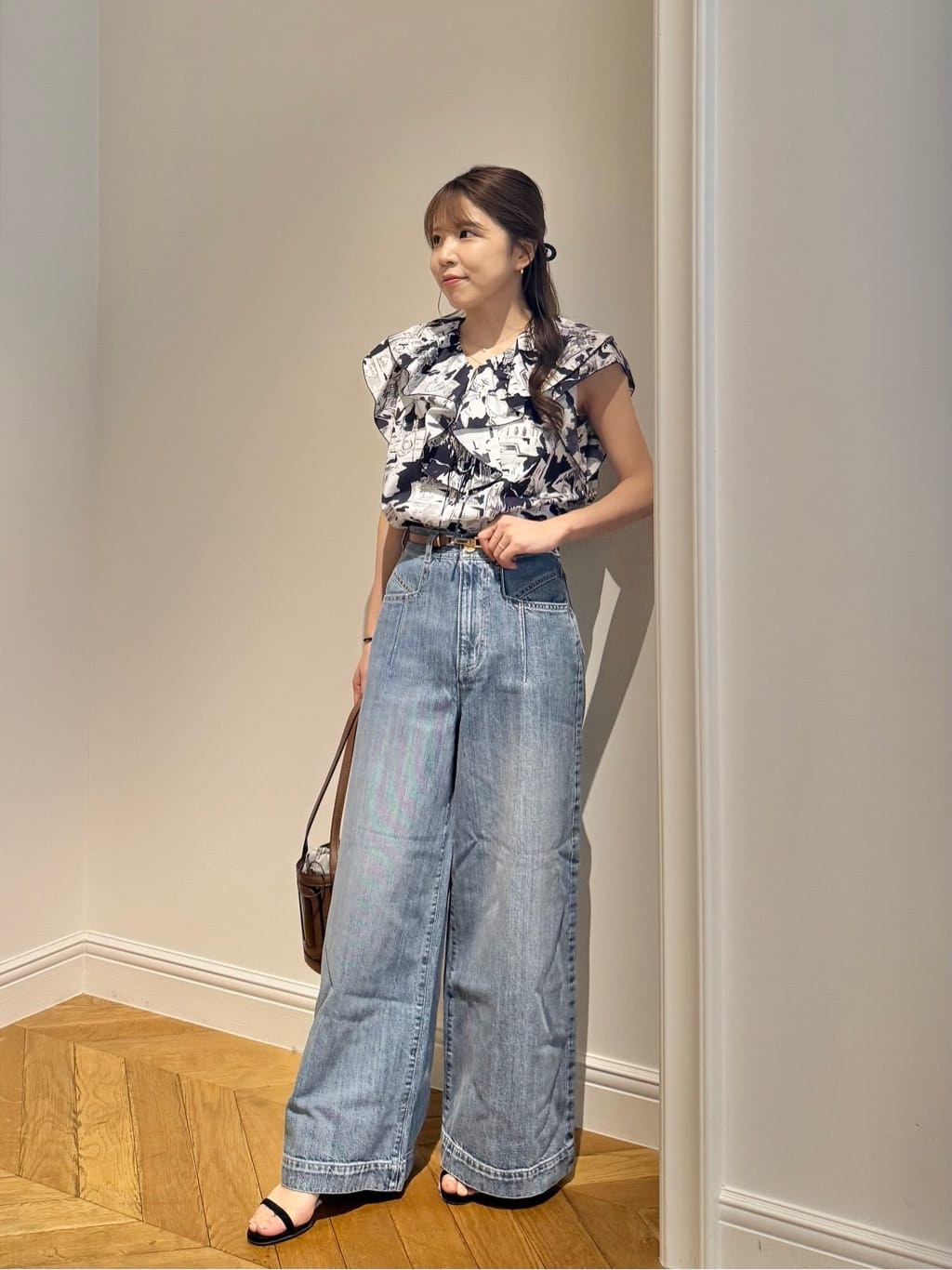 【LOULOU WILLOUGHBY】サマーナイトプリントフリルブラウス 一枚で存在感のある着映えトップス◎ 白×ネイビーの組み合わせのためきつくなりすぎず上品さがあります。 フレンチスリーブにフリルが2枚重なっており、着用していただきやすい袖感! 素材感がとても軽く薄手なため、コンパクトなカーディガンを羽織っていただいても違和感なく着用していただけます。 ジャケットのインナーとしてもgood◎ 胸元はリボンで調節が可能で、お好みにアレンジしていただけます。 ボトムにインでもアウトでもどちらでも高相性。 〇着用感 透け感:なし 伸縮性:なし 光沢感:なし 厚さ:薄手 ※手洗い可能 【LOULOU WILLOUGHBY】◇デニムバギーパンツ とっても形が綺麗なバギーパンツ◎ ハイウエスト気味の脚長シルエットにすっきりとした腰回りでスタイルアップ間違いなし。 カジュアルになりすぎないように、ブルーの色も少し落ち着いていて綺麗めなトップスとも高相性◎ ステッチまで拘り抜いたオリジナルデニムです。 ※人気商品で秋品番になり再入荷 〇着用感 透け感:なし 伸縮性:なし 光沢感:なし ポケット:あり ※手洗い可能 ※照明の関係により、実際よりも色味が違って見える場合がございます。 またパソコン・スマートフォンなどの環境により、製品と画像のカラーが異なる場合もございます。 予めご了承ください。 スタッフ身長 157㎝