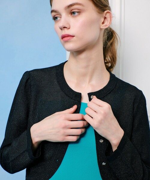 ラメ糸とビジュー釦が華やかなニットボレロ。