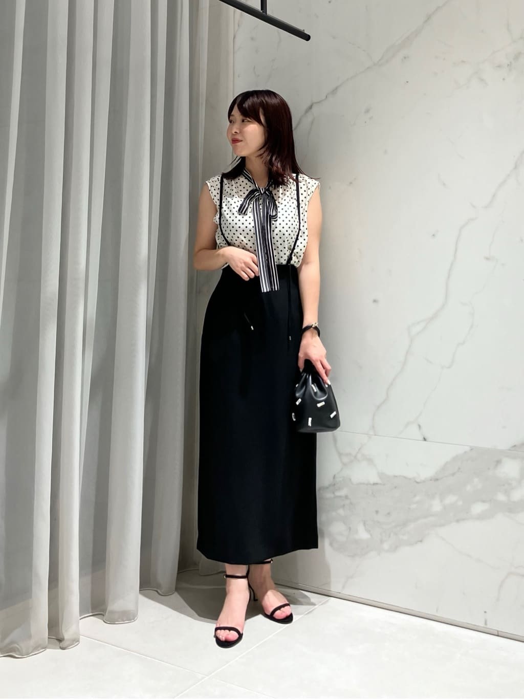 【パネルドットプリントボウタイブラウス】 夏らしい清涼感あるドットブラウス。 ポリエステル100%のつるっとした薄手生地で、シワになりにくく程よいゆとりで楽な着心地◎ ベーシックな色味の細ストライプを使いで甘過ぎない大人可愛いデザインに♪ 裾にもストライプのデザインがあるのでアウトでも映えます。 同素材のパンツ(20252012010)とセットアップもおしゃれな抜け感がありオススメです。 〇着用感 透け感 : ややあり 伸縮性:なし 光沢感:微光沢 厚さ:薄手 ※手洗い可能 【ジョーゼットサロペナロースカート】 上品ジョーゼットのきれいめサロペットスカート。 シワになりにくいポリエステル100%素材で軽く、バックウエストがゴムなので楽な履き心地◎ サロペットの紐が前に垂れている様なデザインで、シルバーの金具がキラッと輝き上品な印象です。 ウエストライン高めで脚長効果抜群♪ オンオフ着回ししやすい一枚あると万能なアイテムです。 ◯着用感 透け感:なし 伸縮性:なし(ウエストのゴムあり) 光沢感:なし 厚さ:薄手 ※手洗い可能 スタッフ身長 155㎝