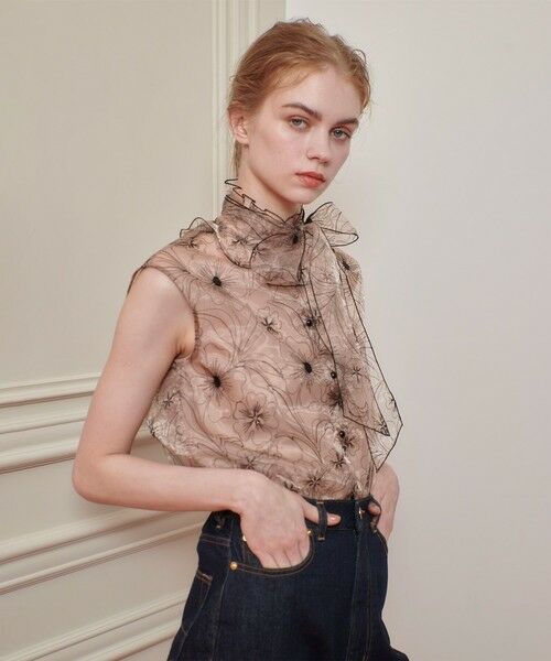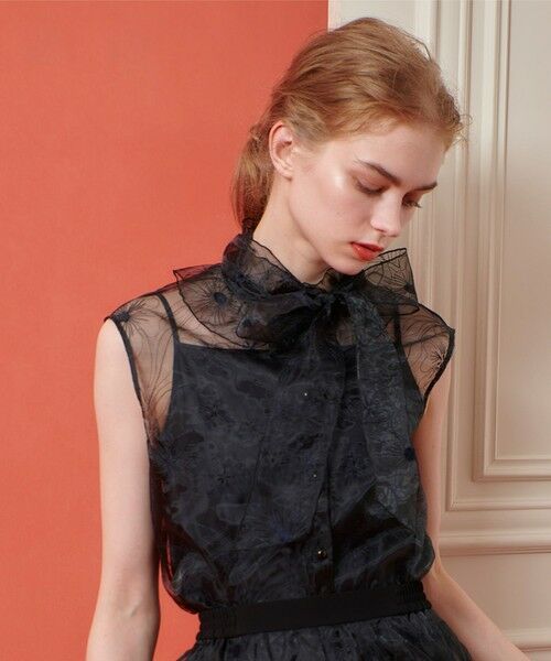 上品な透け感のオーガンジーに刺繍をのせたボウタイブラウス。