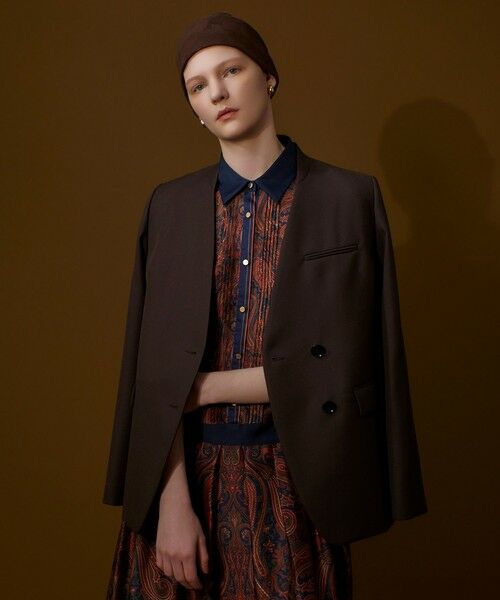 重厚感があり上質さを感じさせる、ドライタッチなウール100%のサージ素材を使用したノーカラージャケット。
