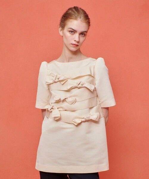 前身ごろにランダムにリボンが結ばれています。袖山にギャザーを入れて膨らみを持たせたハーフスリーブで一枚簡潔です。