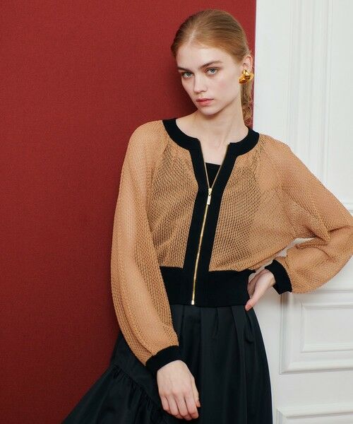 柄編みならではの程よい透け感にしっかりとしたリブ、ゴールドのファスナーが高級感を演出。