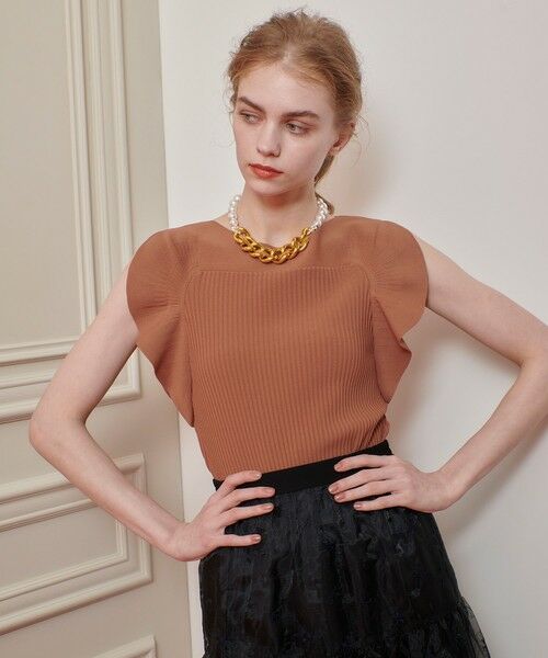 身頃はすっきりとしたリブでインもアウトもしやすく、デザインポイントが顔周りにあるので1枚で華やかな雰囲気に。