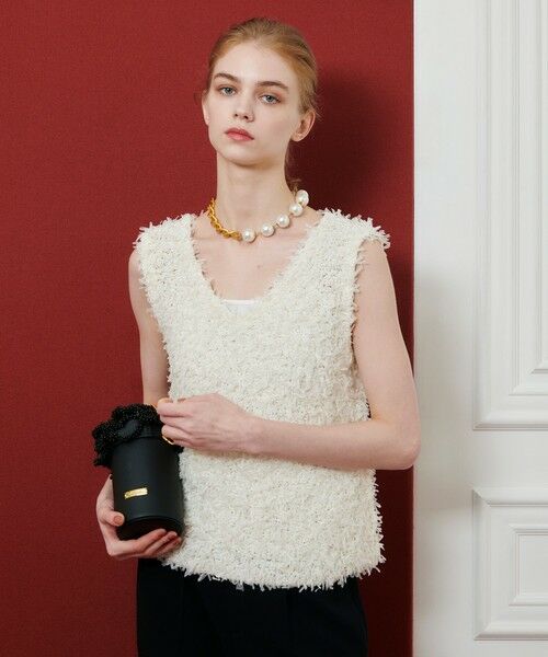 チュールを混ぜ込んだ意匠糸で華やかな生地になっておりシンプルボトムとの合わせだけでスタイリングが決まる着映えトップスです。