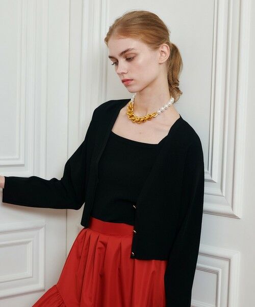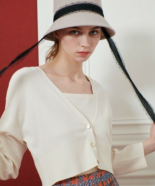 カーディガンは短丈で、重心があがるバランス感がアンサンブルはもちろん、ワンピースの羽織りにしてもバランスの良い丈です。