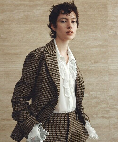 フロントフリルとレギュラーカラーの組み合わせが大人可愛い一枚で、甘い印象を襟が程良く抑えてくれます。