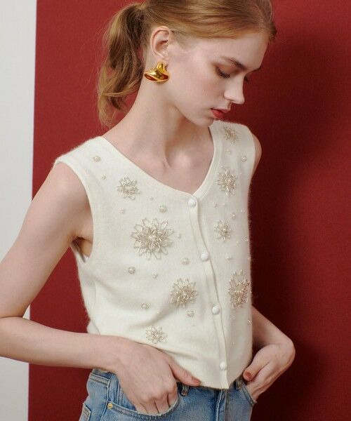 ふわふわのニットに輝くビジューとビーズが華やかな対比を魅せます。