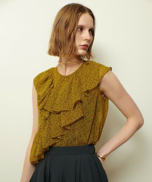 アシンメトリーに配したラッフルが華やかな着映えトップスです。