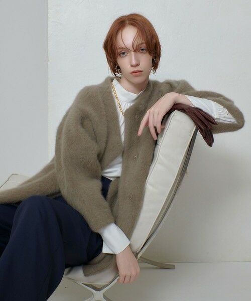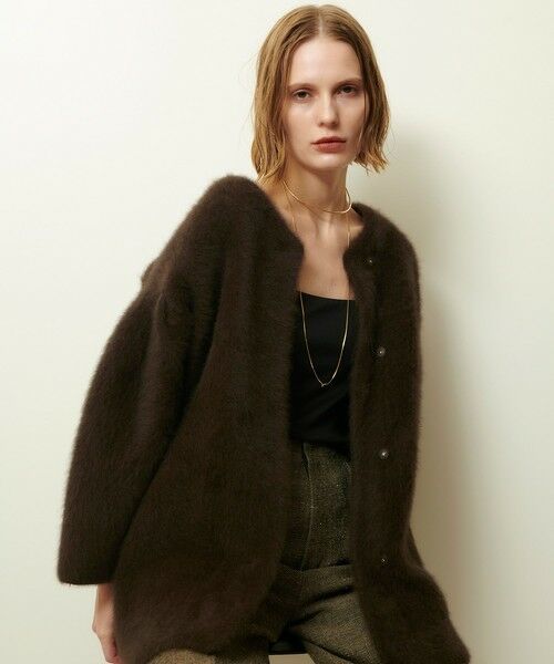 トレサビリティの環境下で飼育されたフォックスの梳き毛だけをカシミヤにブレンドした編地に密に編んだポリエステル編地を裏打ちしてしっかりと膨らみを持たせたコーディガンです。