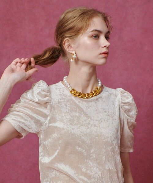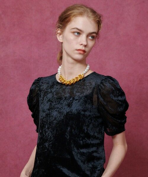 軽やかなシアー感と上品な光沢を兼ね備えたベロア素材を使用した半袖プルオーバー。