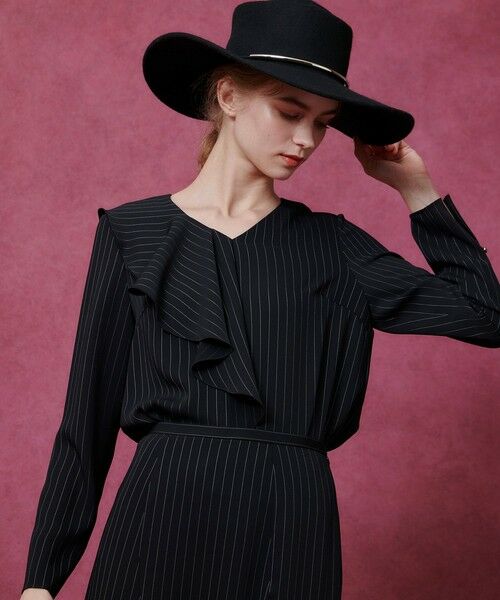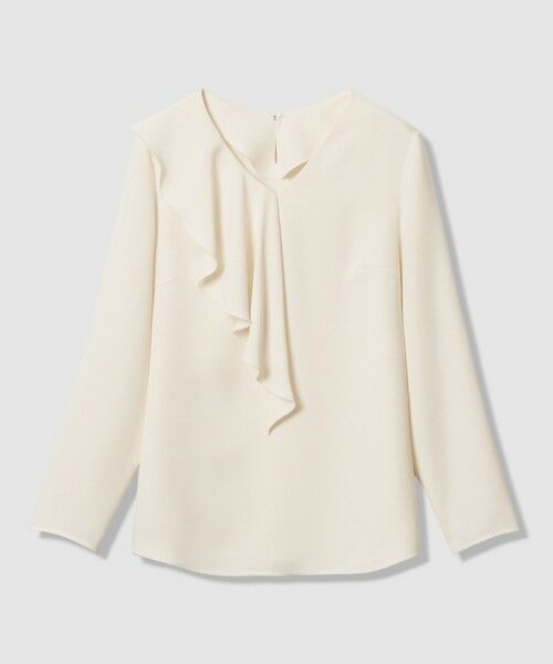 スカーフのようなゆるやかなフリルで女性らしさと単品映えのするきちんと見えブラウスです。