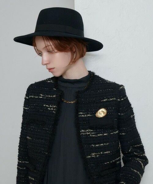 ポケット口や裾口に同色フリンジとテープリボンを施し、立体感のある表情に仕上げた、ノーカラーのツイードジャケット。