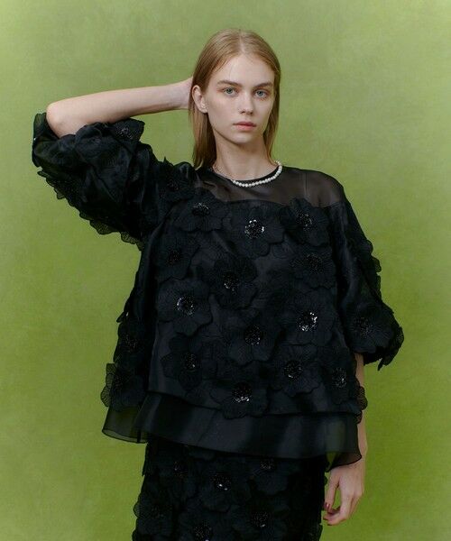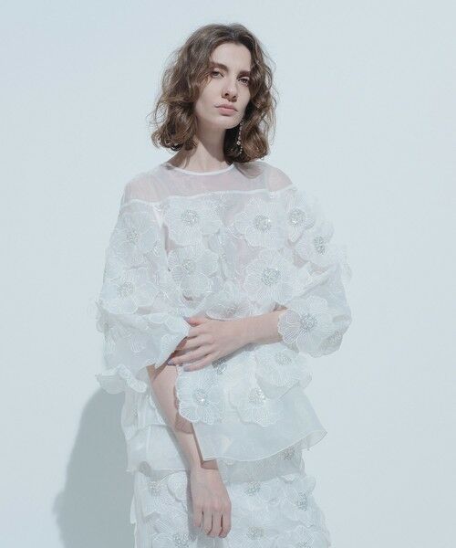 透け感と張り感のあるオーガンジーにし花柄の刺繍をし、さらに上から立体的な花びらとビジューのお花をのせています。