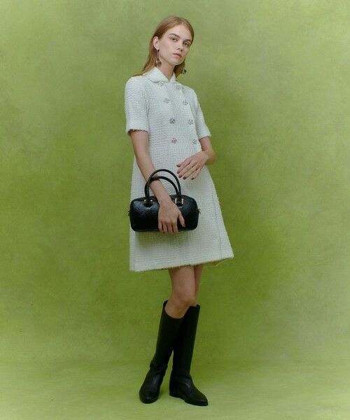 格子柄のツィード編み地は、毛足の長いコットンの糸を組み合わせることで温かみはありつつも分厚すぎない綺麗目な印象に。伸縮も抜群です。