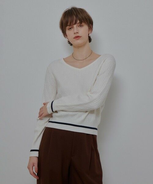 【allureville 2026 Spring & Summer】RWSウールとコットンをブレンドした温みのあるミニケーブルニット。変則的な柄で、トラッド過ぎない抜け感を作り出しました。浅いVネックは1枚で着てもインナーが気にならない絶妙な開き。コンパクトめなパターンでコートインもスッキリです。※照明の関係により、実際よりも色味が違って見える場合がございます。またパソコン・スマートフォンなどの環境により、製品と画像のカラーが異なる場合もございます。予めご了承ください。