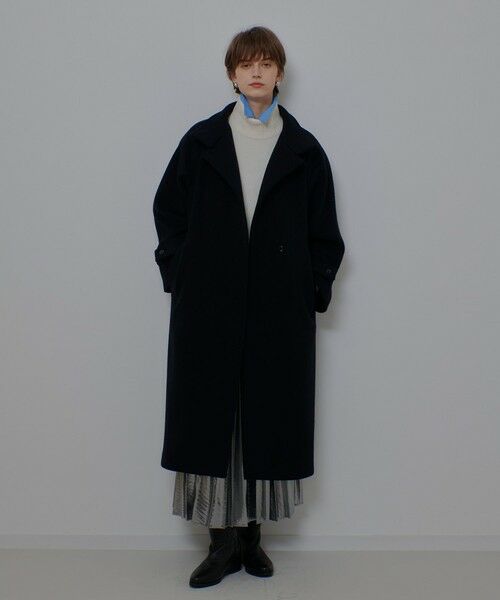Super100’sの原料を使用したウール100%の二重織素材に両面ビーバー加工を施した、温かさと軽さがポイントのコート。オーセンティックなデザインをオーバーサイズかつ女性らしいシルエットにすることで抜け感のある雰囲気に仕上げています。