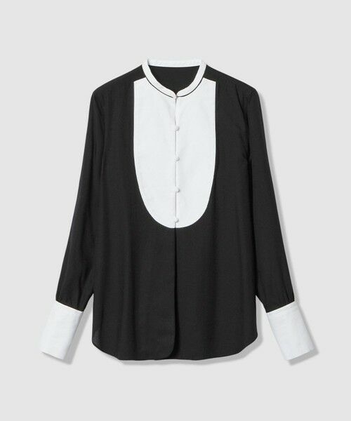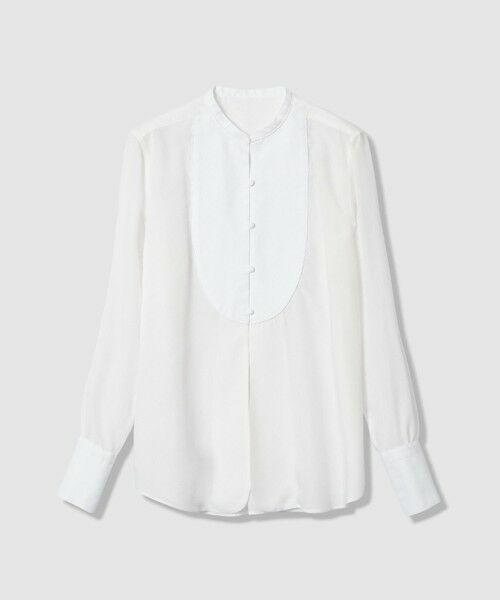 【allureville 2026 Spring & Summer】ユーカリなどの木材パルプを原料とした環境に配慮した再生繊維であるテンセルと、コットンオックスをドッキングしました。シルクのような滑らかな肌触りと光沢があり、吸湿性や速乾性に優れています。元々メンズのドレスシャツが起源とされているブザムシャツのディテールをベースに、パイピング切り替えやロングカフスで更にアップデートされた一着です。ジャケットインにしてもシルエットを崩さず美しく着用することが可能です。※照明の関係により、実際よりも色味が違って見える場合がございます。またパソコン・スマートフォンなどの環境により、製品と画像のカラーが異なる場合もございます。予めご了承ください。