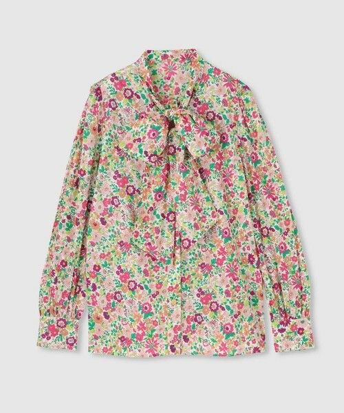 鮮やかなフラワープリントが目を惹く、LIBERTY生地を使用したリボンブラウス。ロングスリーブの上品なデザインがシルエットを美しく見せ、装いに華やぎを添えます。シンプルなボトムスを合わせるだけで大人のエレガントスタイルが完成。気分まで明るくしてくれる、ワードローブに迎えたい一着です。