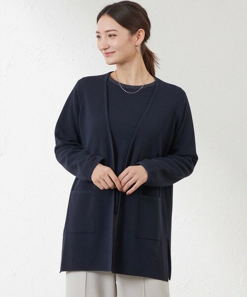 ミラノリブの着流しカーディガンです。着回しやすいシンプルなデザインでアウトポケットがポイントです。