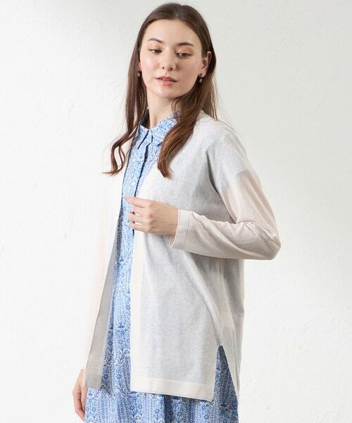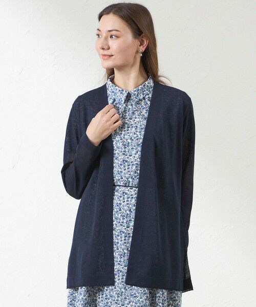 ナチュラルミックスカーディガン【デザイン】着回しのきくシンプルなデザインの着流しカーディガンです。脇はゴム地で切り替えてあり、前立は見返し仕様ですっきりとした印象に仕上げました。脇はスリットあきになっています。【素材】綿のしなやかな風合い、麻のナチュラルな清涼感にポリエステル糸を複合した素材です。シャープなタッチと光沢感を兼ね備えた涼し気な素材感です。手洗い可能でお手入れもしやすくなっています。