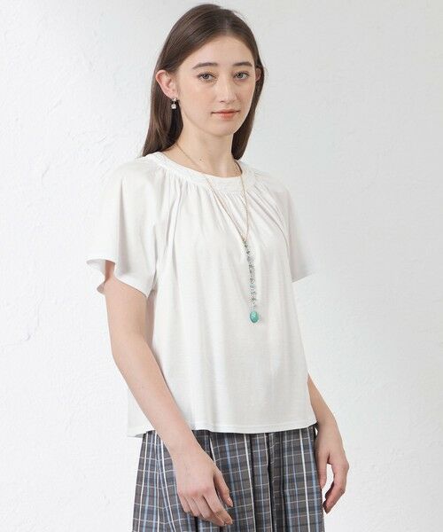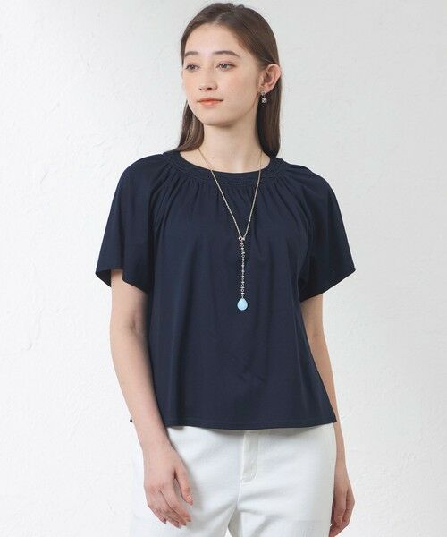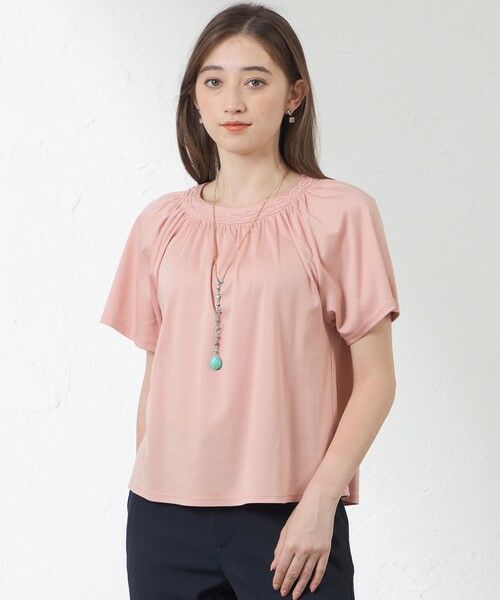 前襟ぐりにロープ柄のレースを施したエレガントなカットソーです。ラグランスリーブで動きやすく肩幅を華奢に見せてくれます。スカートとも合わせやすいコンパクトな着丈で色々なアイテムとも合わせていただきやすいです。