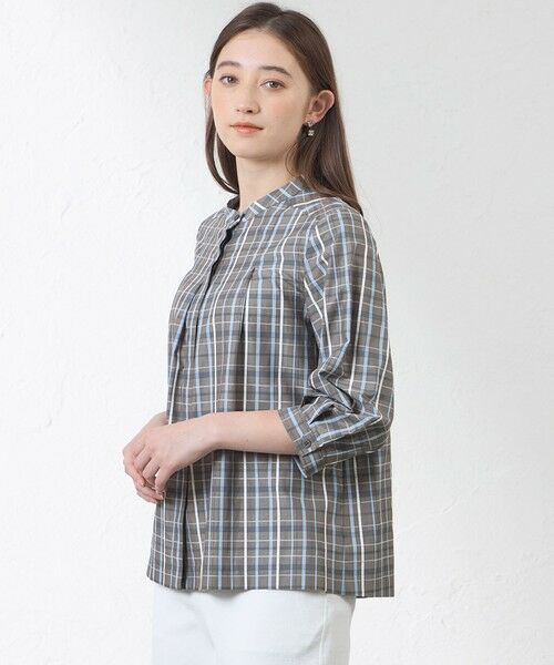 スキッパータイプのスタンドカラーシャツです。型と前立て部分に寄せた中縫いタックがポイントです。セットインスリーブでコンパクトなサイズ感なので、スカートとセットアップでスタイリングして頂けます。
