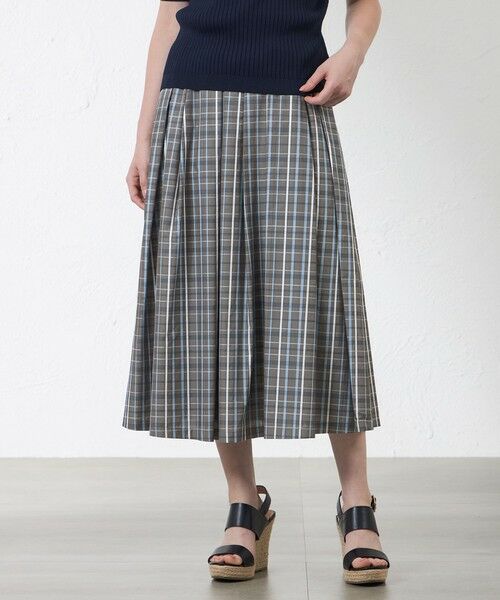 レオファインチェック タックスカート【デザイン】後ゴムのタックスカートです。先染めのサテンストライプ部分が割としっかりしているのでウエスト部分がスッキリ見えるようパターンメイキングしました。セットアップでも、Tシャツと合わせても夏らしい着こなしが楽しめます。【素材】キュプラの柔らかくしなやかな風合いとリネンの清涼感を持ち、ポリエステルの強度でしわを軽減させたハイグレードな混紡素材です。接触冷感、紫外線対策の機能を持つ夏に嬉しい機能素材です。