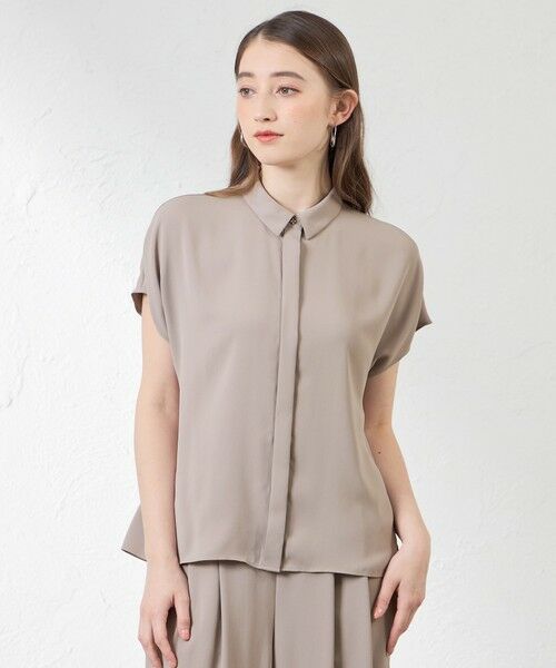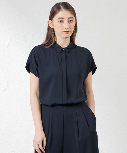 衿付きの前あきブラウスです。第一釦には繊細なフラワーモチーフの釦をアクセントにし、前立ては略比翼ですっきり見えるようにデザインしました。 ボディはややゆったりめでからだのラインを拾いにくく、リラックス感がありながらもきれいに見えるシルエットに仕上げました。 落ち感のある素材でフレンチスリーブが上品な雰囲気ながらも涼やかに着ていただけます。