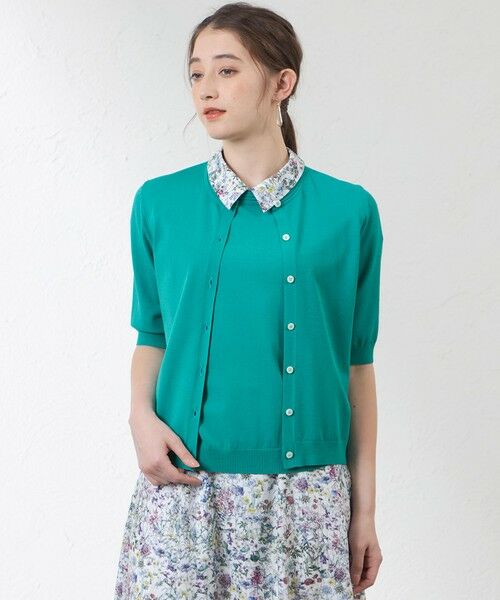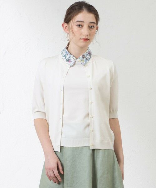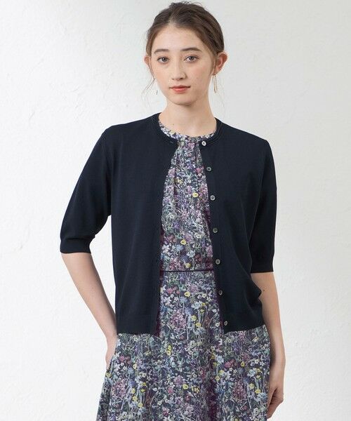 ブライトレーヨンカーディガン【デザイン】5分袖のベーシックな丸首カーディガンです。衿の編み柄がポイントで、華やかさがプラスされています。度違い天竺でシャドーボーダー風のさりげない表面感があり、夏にも涼しく着られるカーディガンです。【素材】シルクをブレンドした上品な光沢のあるレーヨンストレッチ素材です。しなやかな伸縮性としっとりとした柔らかさを実感頂ける夏に嬉しい素材感です。手洗い可能でお手入れしていただきやすいです。