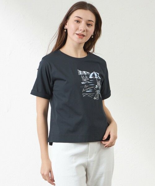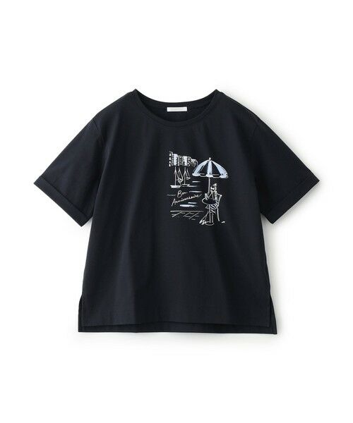 南フランスの海辺でパラソルの下、飲み物を飲む女の子。文字が刺繍でブルーの飲み物をグリッタープリントでで表現し、かわいらしく夏らしいプリントに仕上がりました。おとなの女性が安心していただけるサイズ感、素材感、デザインとなっております。