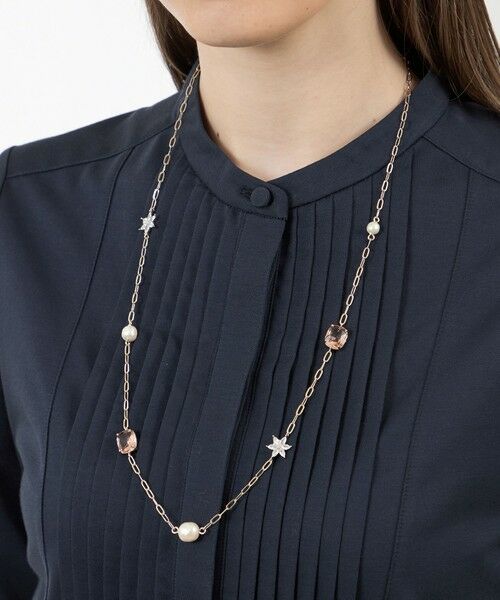 ガラススターステーションネックレスライトピンクのフレームつきガラスパーツと輝きの美しいスタービジュー、大きさの異なるパール調パーツを組み合わせた優しい雰囲気のネックレスです。シンプルトップスにコーディネートして華やかにみせてくれます。※この商品はサンプルでの撮影を行っています。実際の商品とイメージ、仕様が異なる場合がございます。