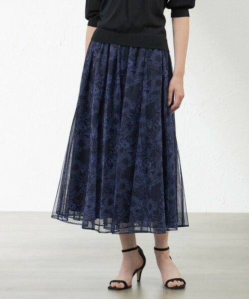 リバティプリントをポリエステルチュールにプリントしました。ウエストのギャザー分量で太って見えないよう、裾にいくつもフレア切り替えを入れてウエストはスッキリ、裾にはボリュームを出したデザインです。ウエストはサテンのゴムベルトになっているのでストレスフリーで着ていただけます。カラーもややダークに仕上げているので秋を先取りできるアイテムです。
