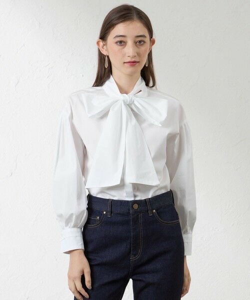衿に大きなボウが付いた印象的な白ブラウスです。THOMAS MAISONという綿のシャツ地で有名なファブリックメーカーの素材を使用しています。「シーズンの立ち上がりには絶対白のシャツとデニム」という初代ディレクターである武川英子氏のエスプリを大事に作った特別なブラウスです。